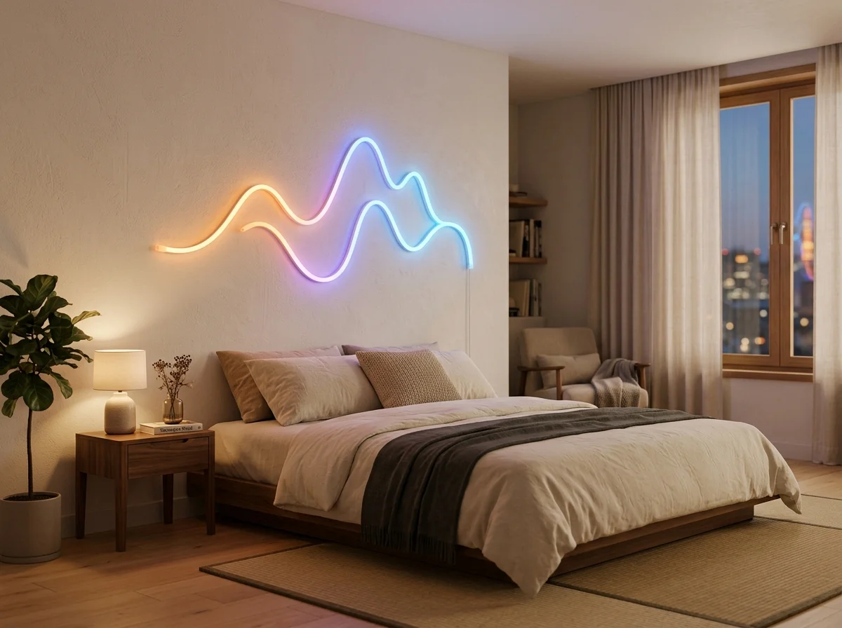 ベッドヘッドにネオンライト(5m)を波形に設置する。就寝前は暖色オレンジの10%にする。23時自動点灯、24時自動消灯で毎晩のルーティンが自動化される。一人暮らし活用ガイドにも例がある。